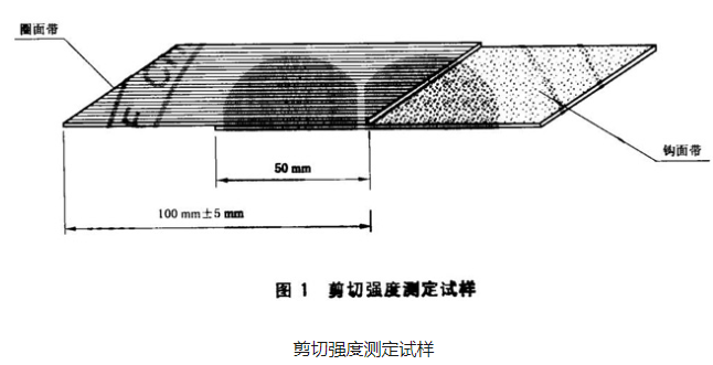 剪切强度方法如下:在规定的试验条件下,将粘扣带有效闭合区域沿其长度方向以恒定速度拉伸,使钩面带和圈面带平行分开每单位面积所需的最大力。